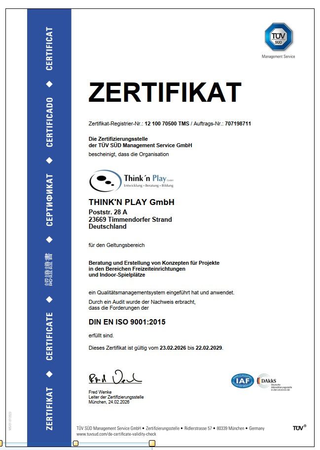 Die THINK’N PLAY GmbH versteht Qualität als Grundlage für nachhaltigen Erfolg und gesellschaftliche Wirkung. Als innovatives Unternehmen mit den Bereichen THINK (Entwicklung und Beratung für gemeinnützige Organisationen) und PLAY (Entwicklung